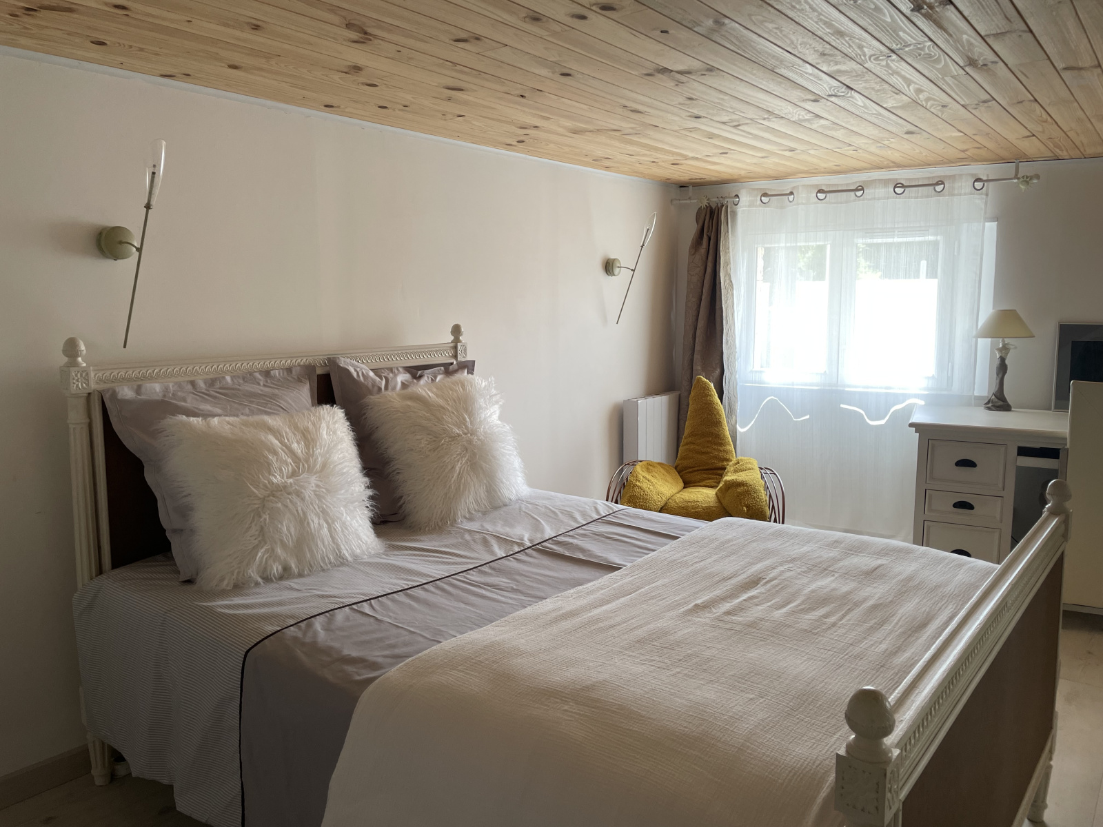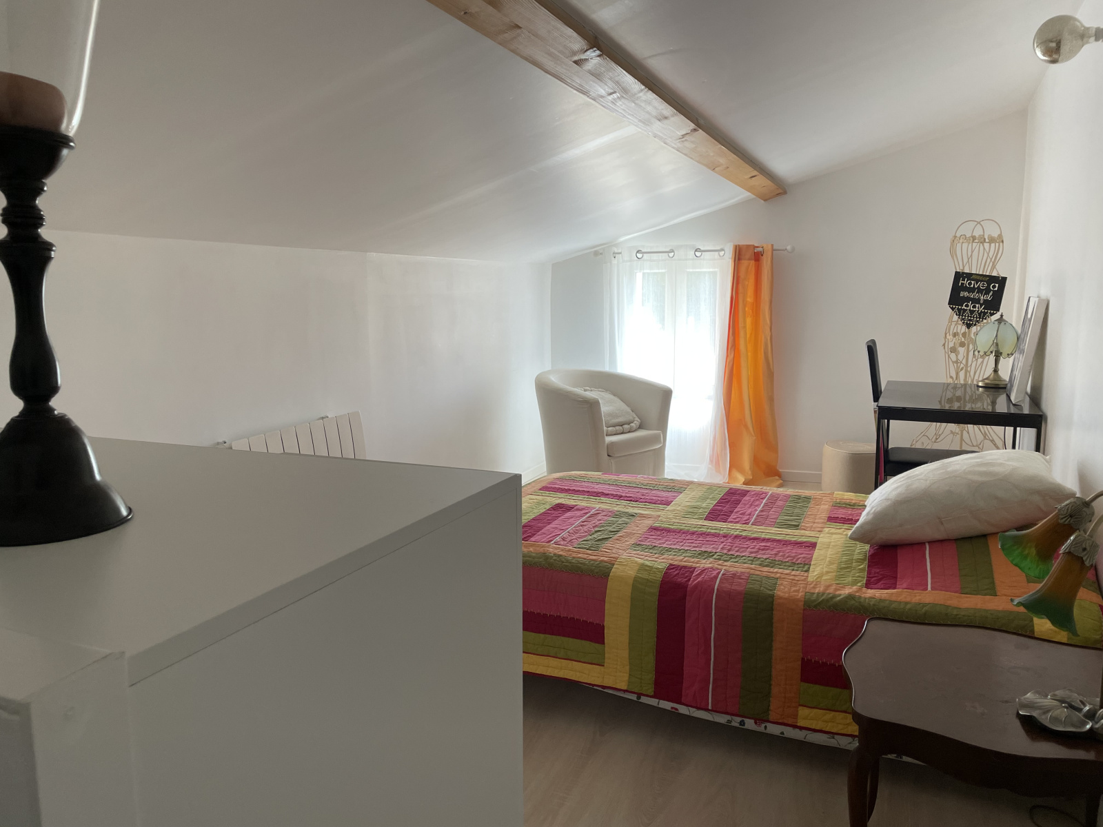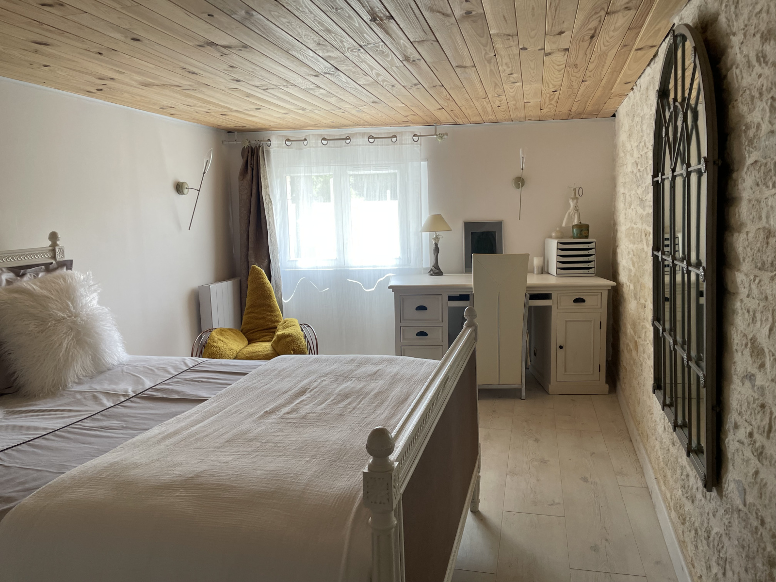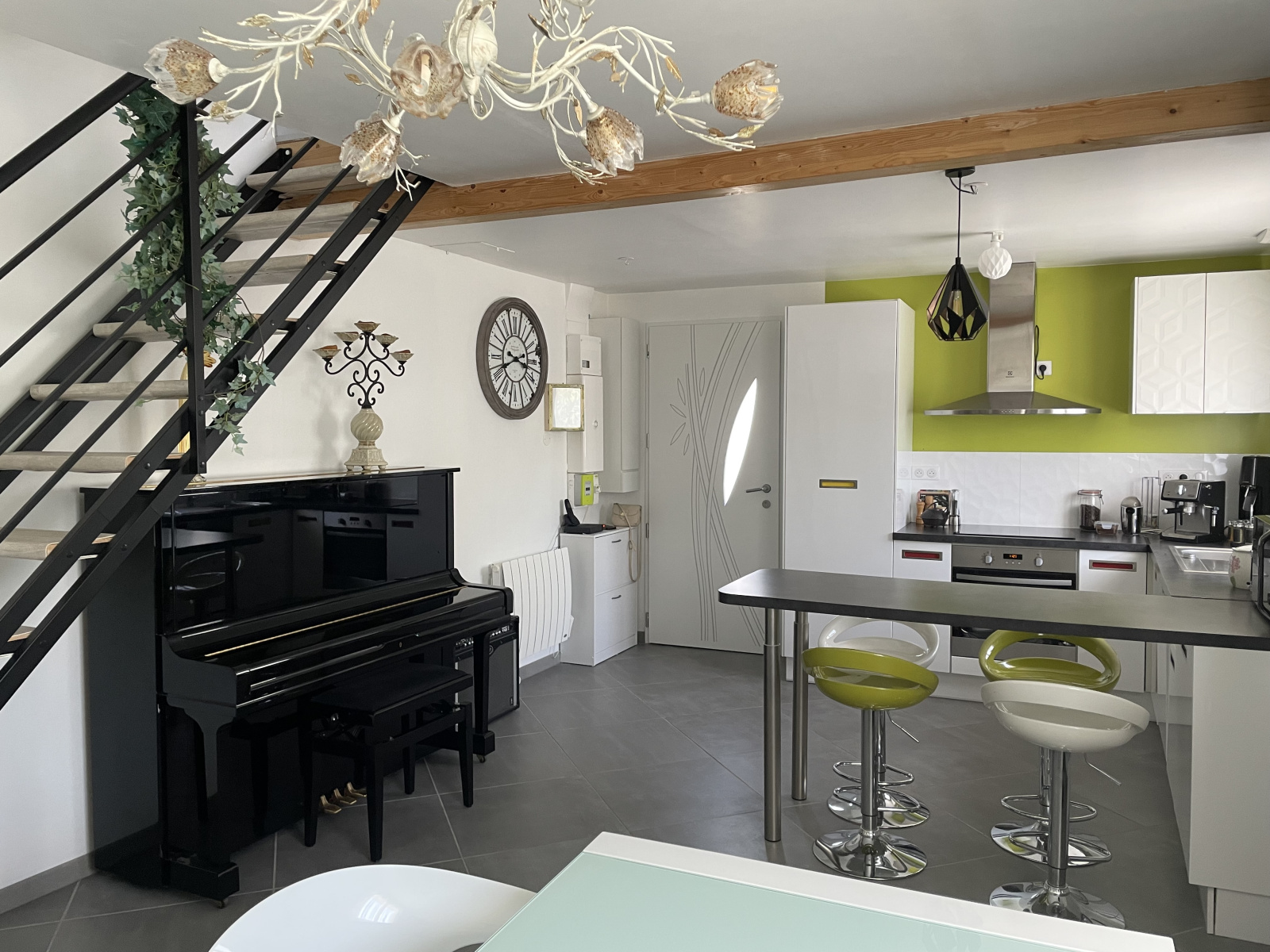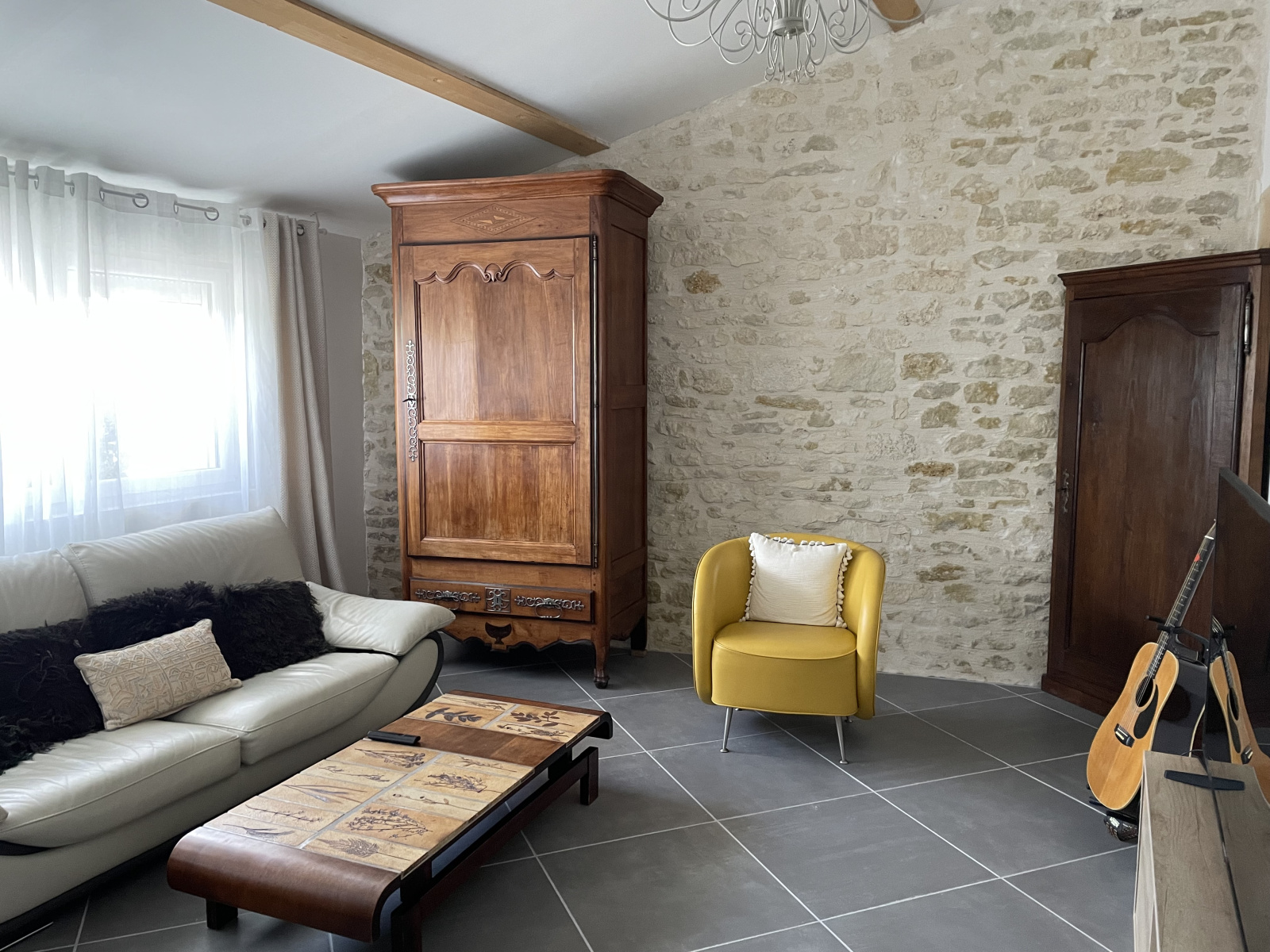 Entre Aigrefeuille et Surgères, jolie maison en pierre entièrement rénovée comprenant au rez-de-chaussée : entrée sur une pièce de vie avec cuisine US aménagée / équipée et un poêle à bois, un salon avec pierres apparentes, buanderie + WC, une chambre avec rangement et un escalier donnant sur une chambre mansardée.