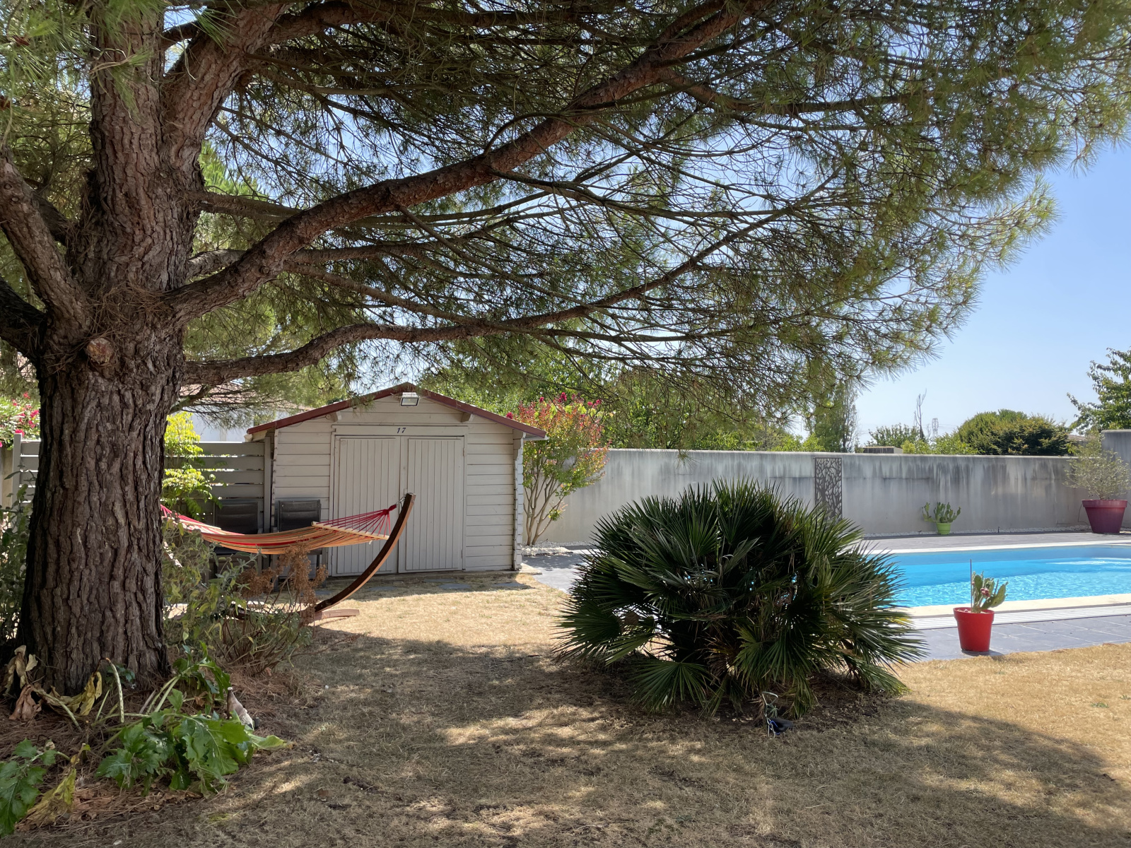 Côté jardin, vous trouverez un double garage, une pergola et une piscine 4 x 10 m, le tout sur un terrain clos et arboré de 800 m² environ, hors lotissement. Proche commerces, école et toutes commodités.