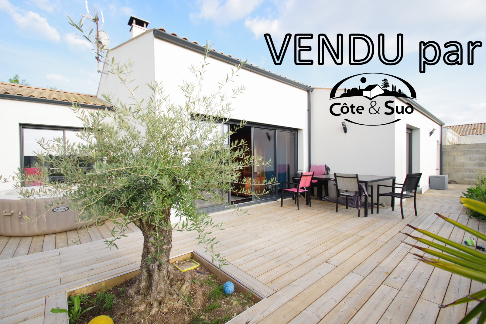 Proche commerces et écoles, joli pavillon dans un esprit contemporain comprenant entrée, WC, belle pièce de vie avec poêle à bois, cuisine US A/E, buanderie, salle de bains avec douche italienne, 2 chambres (placards), suite parentale avec salle d'eau et WC, dressing, bureau. A l'étage une chambre mansardée. Garage attenant, et un garage non attenant, belle terrasse bois. Chauffage au sol éléectrique. Le tout sur 690 m² de terrain clos.