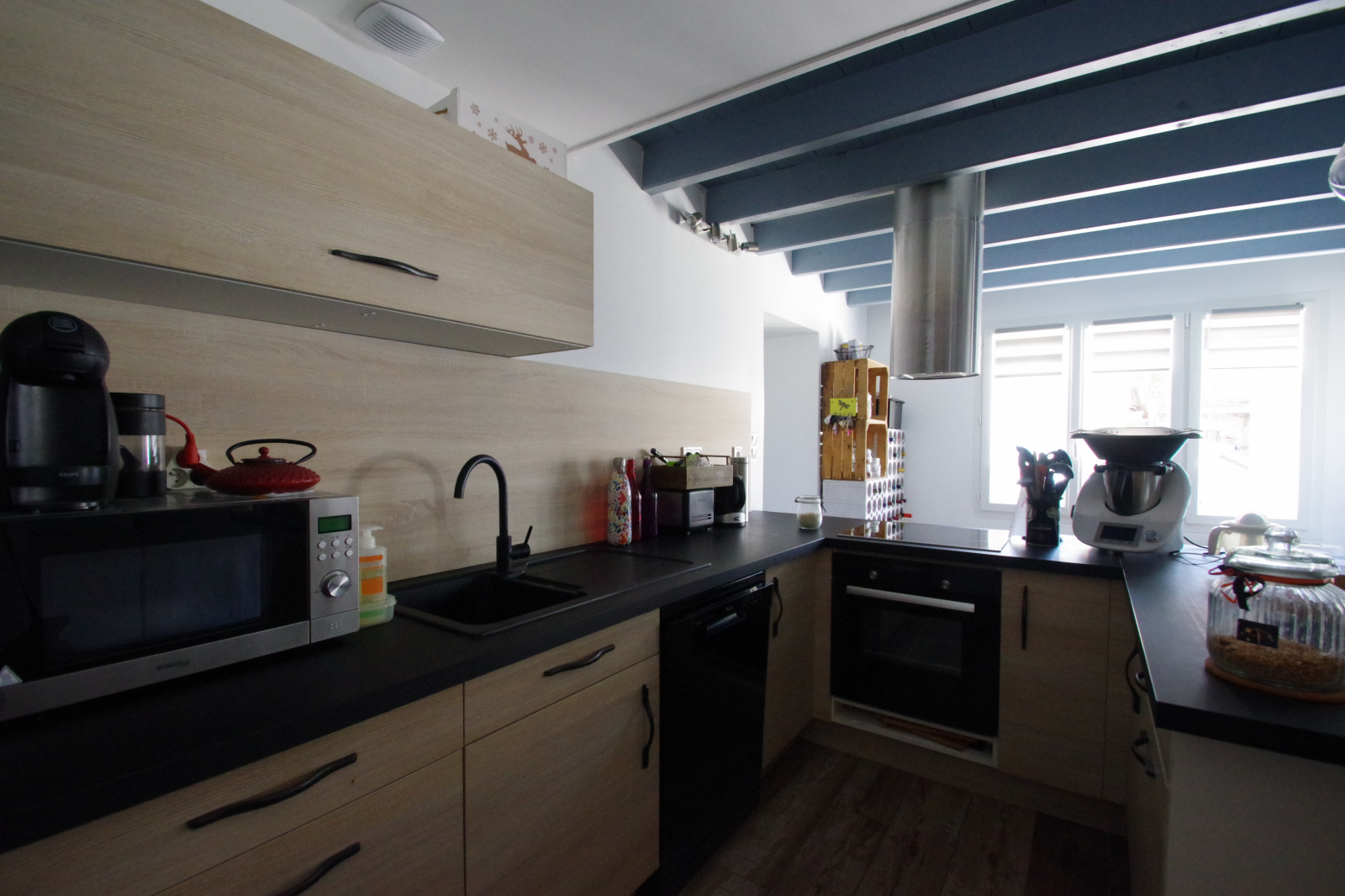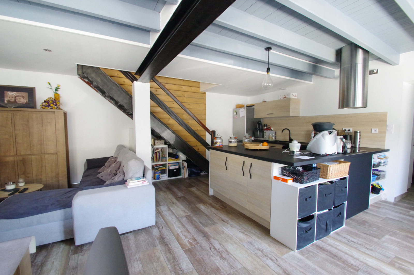 Maison de bourg en très bon état dans un esprit loft, comprenant : entrée, buanderie, WC, belle pièce de vie avec cuisine US aménagée / équipée. A l'étage, un palier desservant 2 chambres avec placard et une salle d'eau. Terrain de 300 m2 non attenant mais à 50 mètres environ de la maison.