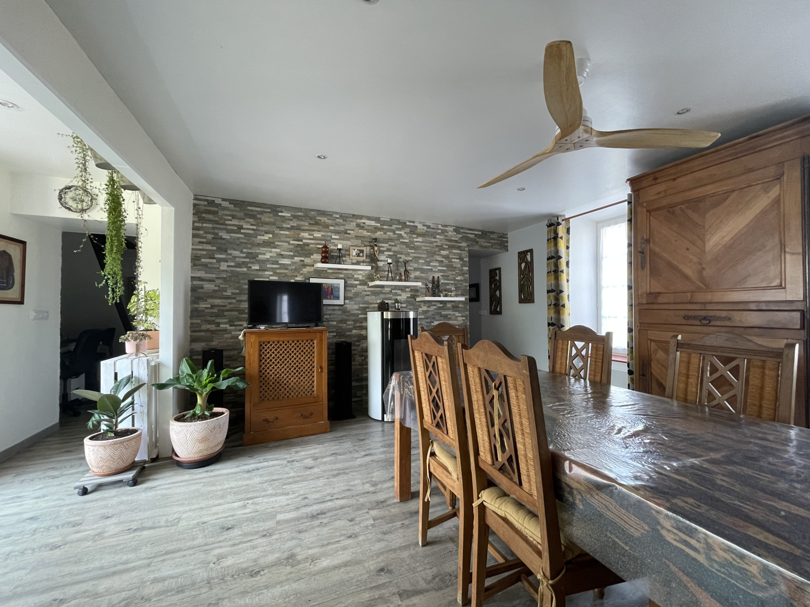 Maison ancienne rénovée avec goût comprenant : entrée, pièce de vie avec poêle à granule, cuisine semi-ouverte A/E, salon, bureau, dégagement, chambre, salle d'eau + WC, grande buanderie (au dessus 2 chambres en enfilade mansardées). A l'étage une grande suite parentale avec dressing, WC, SDB avec douche italienne, chambre (23 m²) possibilité de faire 2 chambres.