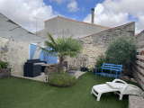 Joli jardinet clos de murs avec terrasse et stationnement voiture.