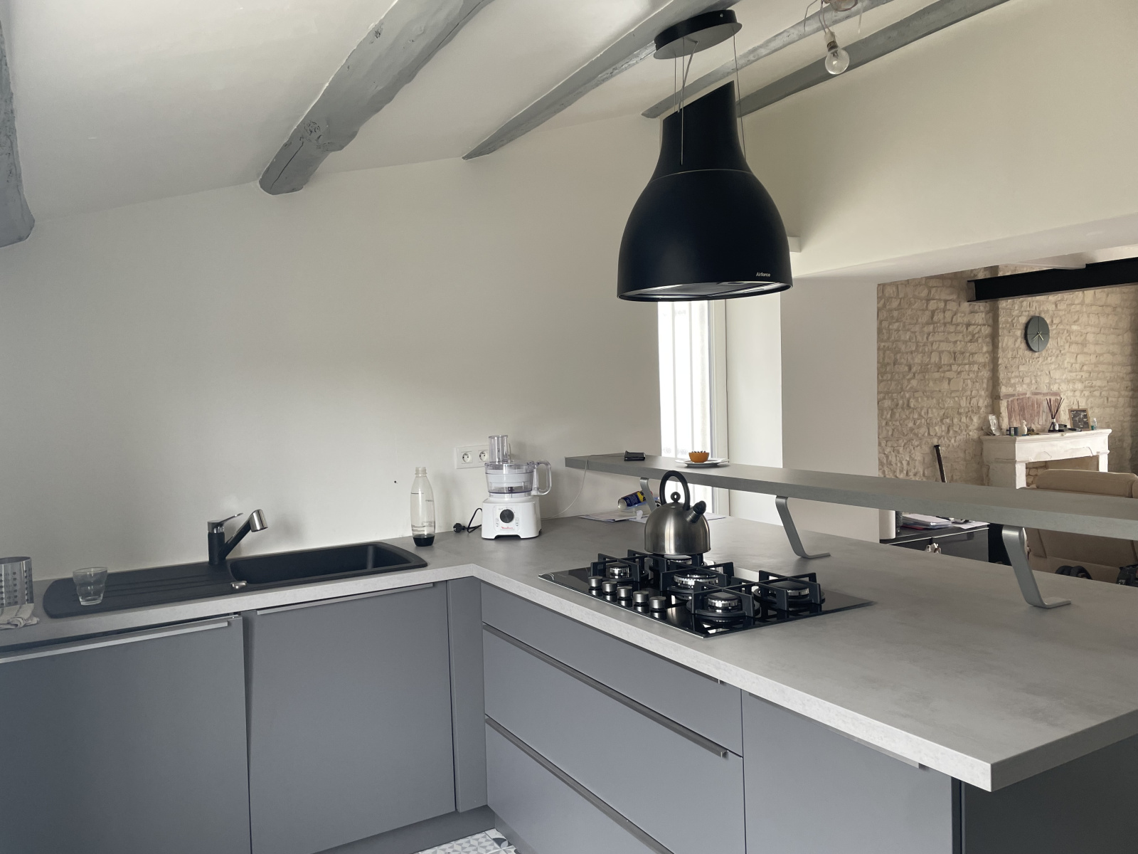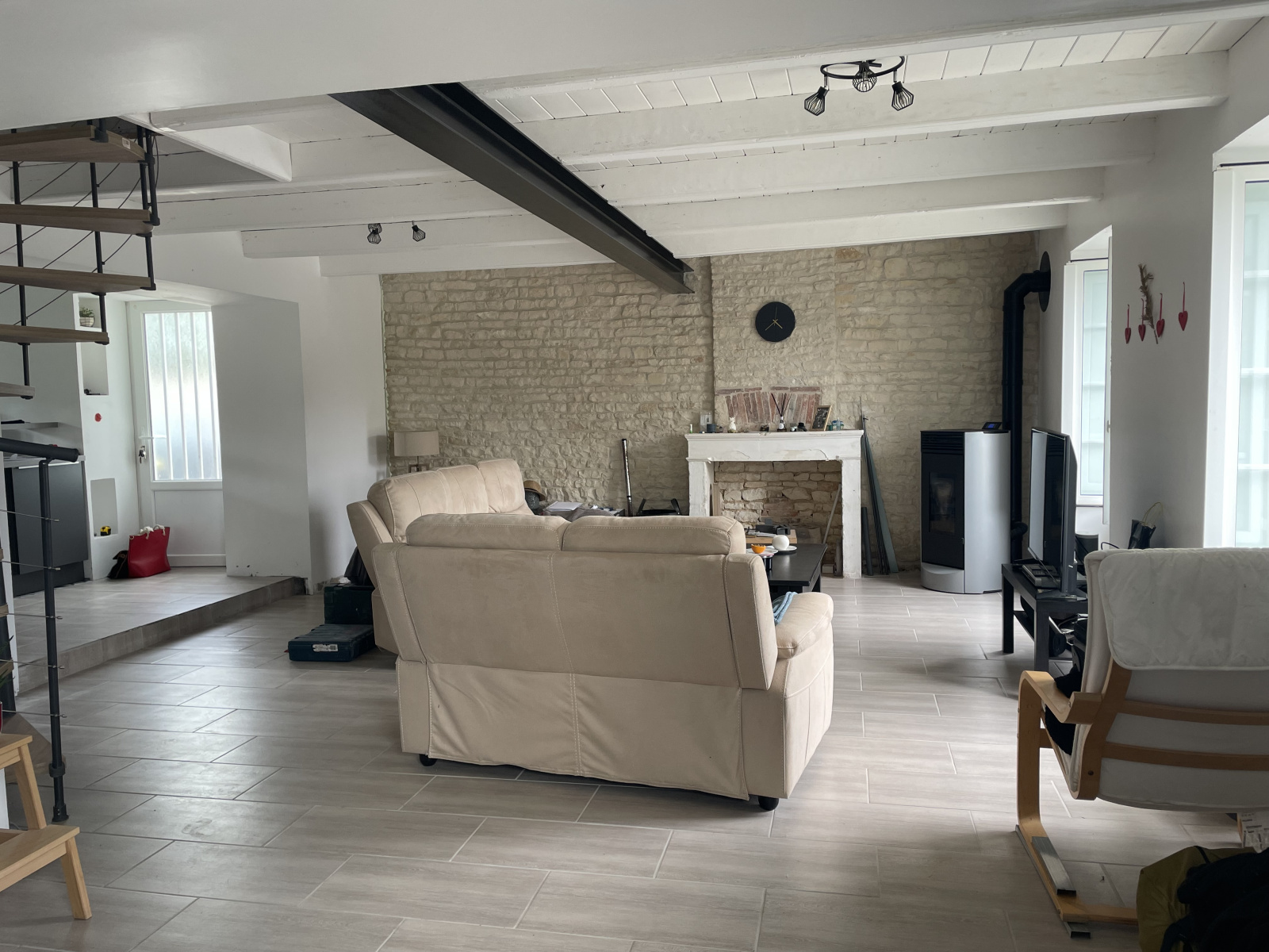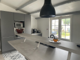 Charmante maison ancienne rénovée comprenant au rez-de-chaussée : une belle pièce de vie avec pierres apparentes et poêle à granules, cuisine US aménagée / équipée, cellier, WC (lave-mains).