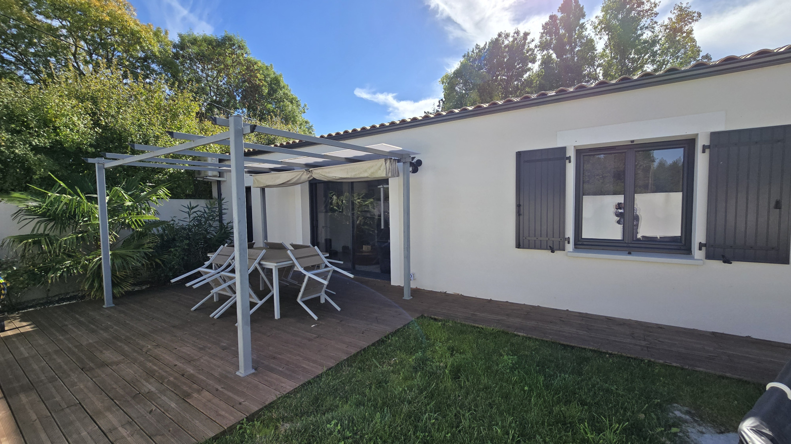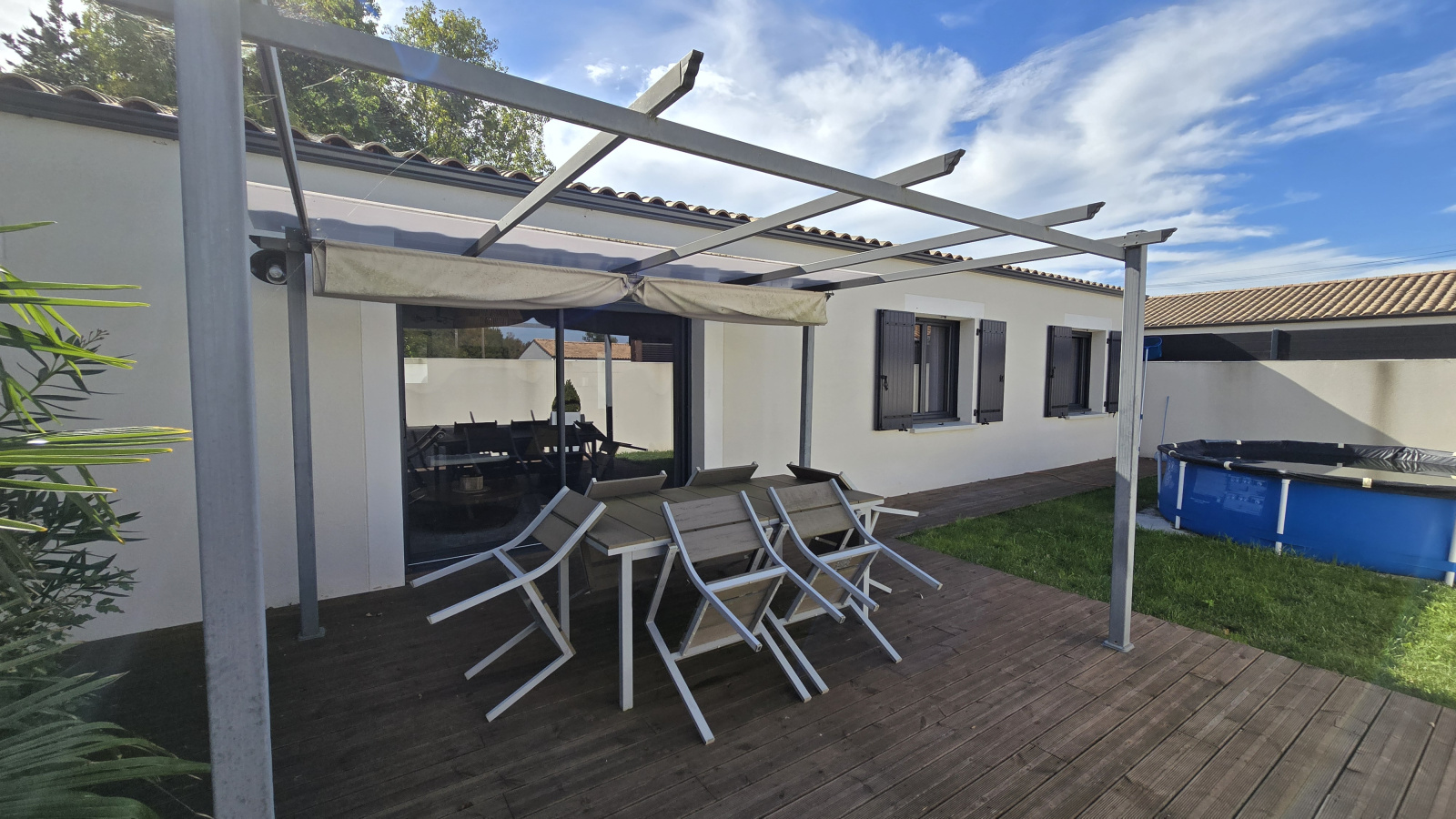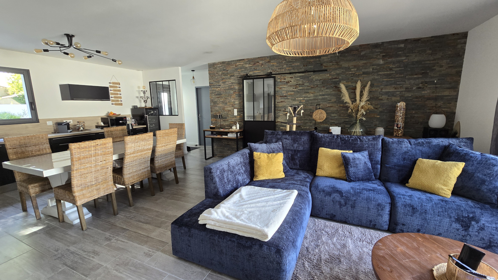 EN EXCLUSIVITE, Jolie maison de plain-pied hors lotissement comprenant : entrée (placard), WC, belle pièce de vie avec cuisine US aménagée / équipée, dégagement, trois chambres (dont une avec dressing), salle de bains et garage. Chauffage par pompe à chaleur air / air.