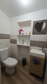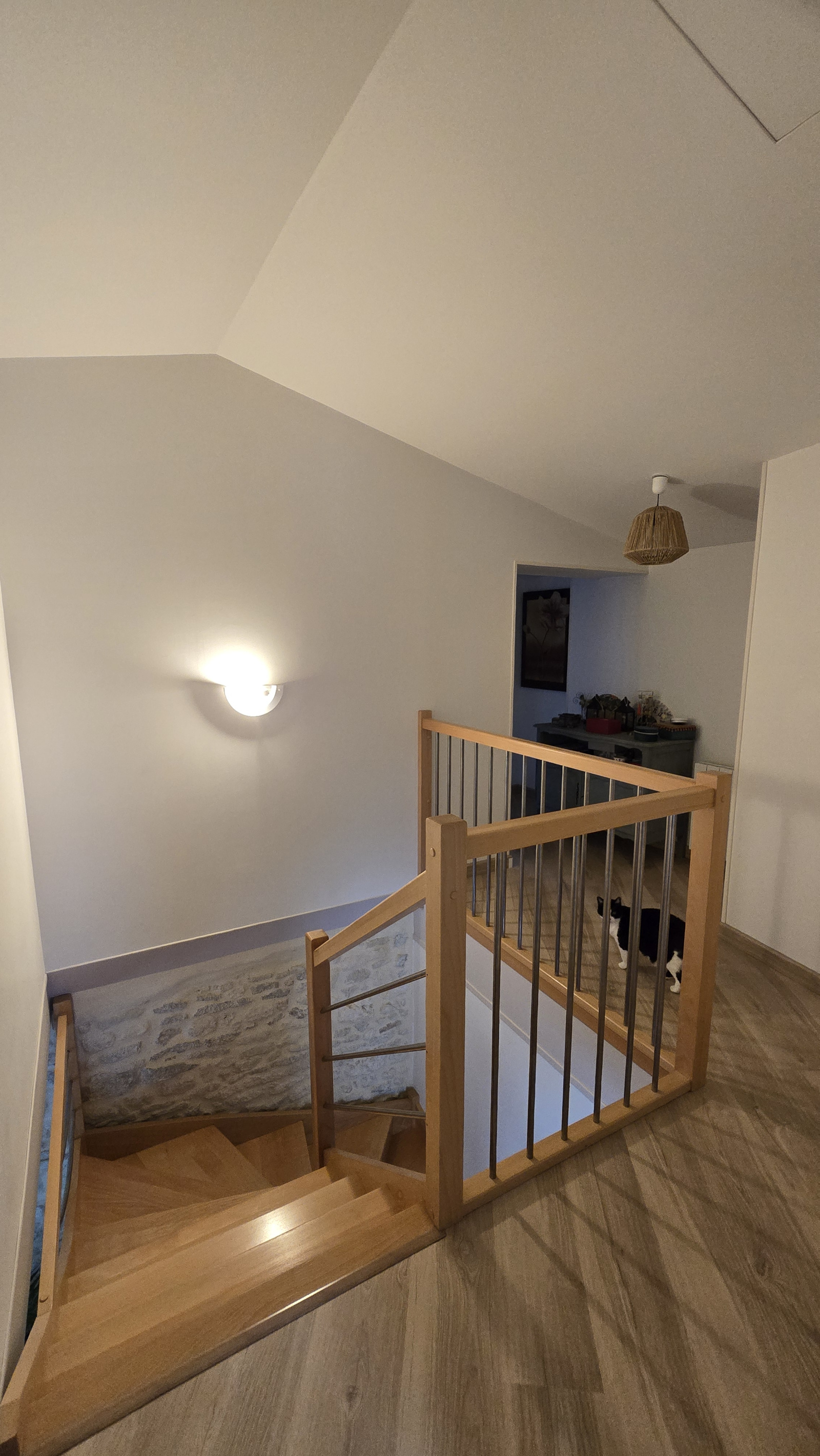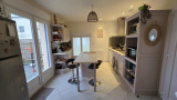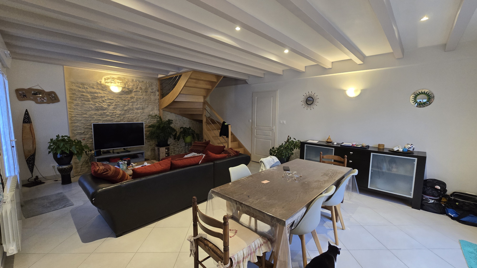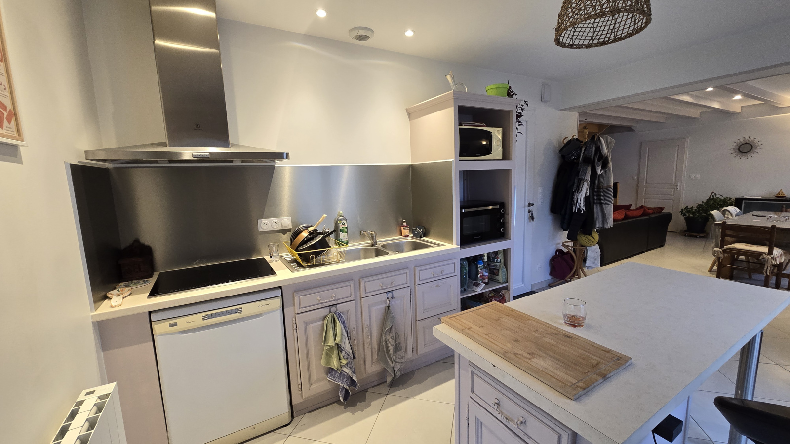 En centre bourg, à proximité des commerces et école jolie maison en pierre rénovée avec goût comprenant une grande pièce de vie avec cuisine US, buanderie, wc, salle d'eau. A l'étage palier desservant 4 chambres avec placard intégré, salle d'eau et wc.Garage avec porte motorisée. Courette de 50 m² environ donnant sur la pièce de vie.